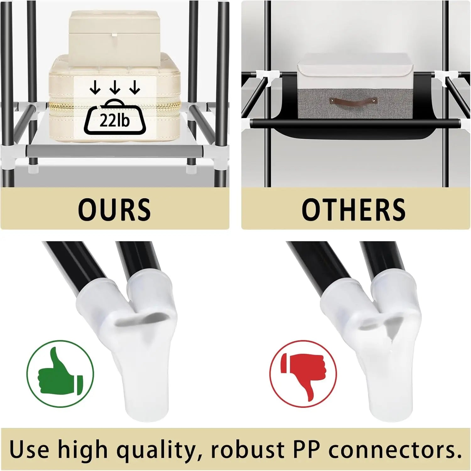 - 65.4" height with a hanging rod and four sturdy shelves provides dedicated space to hang dresses, shirts, and foldable items, keeping everything accessible.