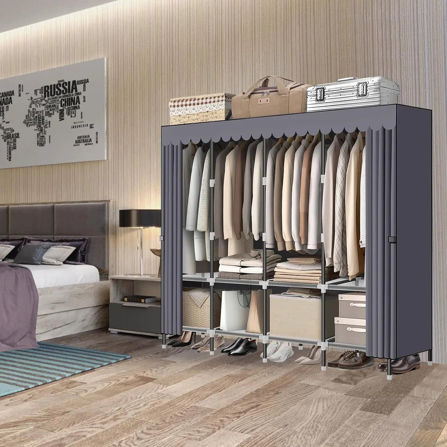 Transform clutter into organized storage with this portable wardrobe closet featuring a steel frame, zippered non-woven cover, and four shelves.